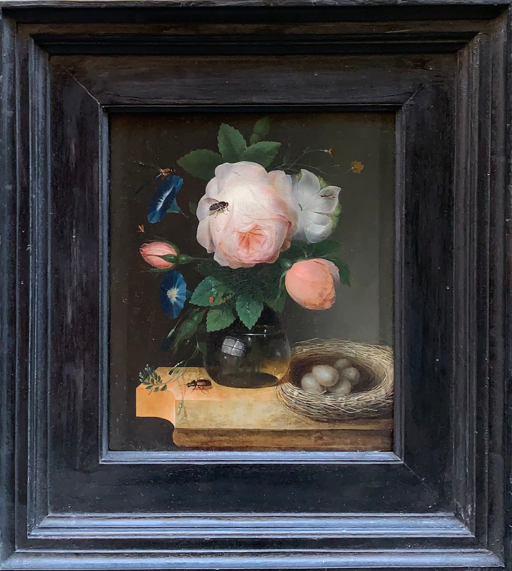 This intricate still life, representative of Dutch Golden Age ideals, captures the essence of fertility, prosperity and transformation. At the heart of the composition a wicker basket is seen overflowing with fresh fruits of plums and peaches, both signs of good health and fruitful marriage, their vivid hues evoking vitality. A bird is also depicted perched on a branch of ripe cherries, a sign of wealth and fertility. Cherries in the period were commonly used in Dutch paintings as a sign of the new age of global trade and consumption, an emblem of forging luxuries while also being commonly associated with the souls of men. Other symbols in the work that allude to fertility are seen through the represented insects, the wasp as a sign of change and the moth as a symbol of transformation. Additionally, the glistening opulence of the cluster of grapes contributes to the paintings overarching message of a celebration of the fruits of life, fertility as well as health and transformation, inviting the viewers to reflect on the interplay of nature and human existence through timeless motifs.