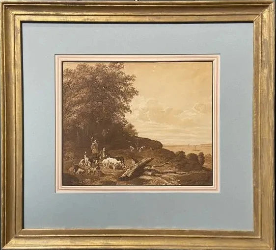As with this piece, Lingelbach’s settings evoke a feeling of space and distance, as if they were being remembered. In common seventeenth-century Flemish and Dutch practice, he was called on to enliven other artists’ landscapes by painting in the staffage, the figures and animals that animate the scene. Meindert Hobbema regularly hired Lingelbach to populate his landscapes.