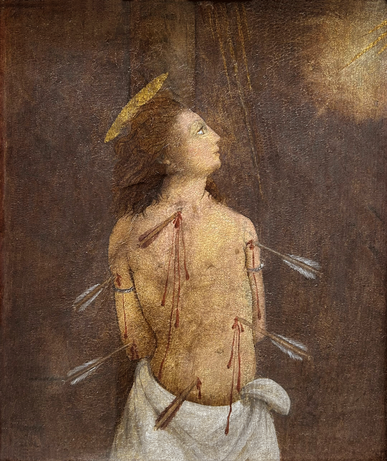 The artist places the protagonist in the foreground, painting him in a bright light with delicate chiaroscuro shading against a background of darker colours with rays of gold shinning down. Six bloody arrows pierce Saint Sebastian’s body. Saint Sebastian is tied to a post and stares to the light shinning down from the top right corner.