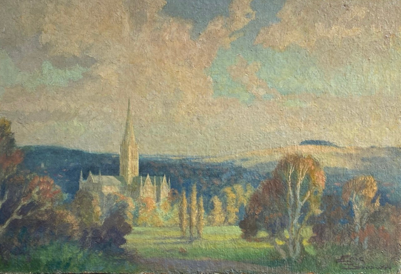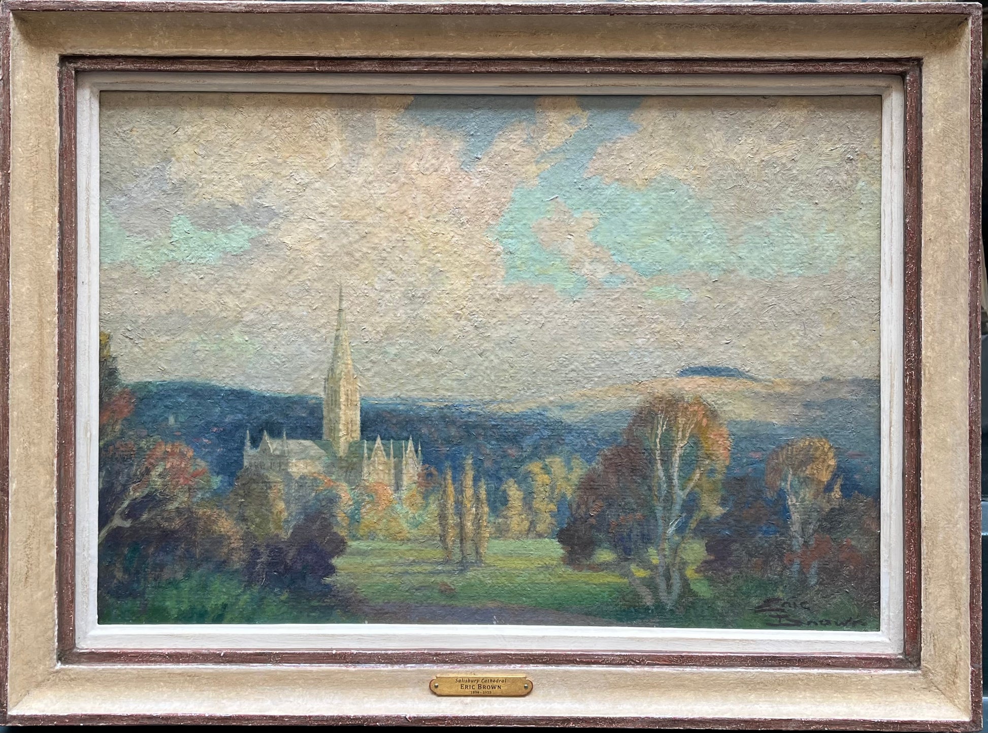 Eric Brown always painted in oil which were mainly distant views of his local Salisbury or rural views in the surrounding countryside. His works have an innocence about them which captured the English countryside perfectly.