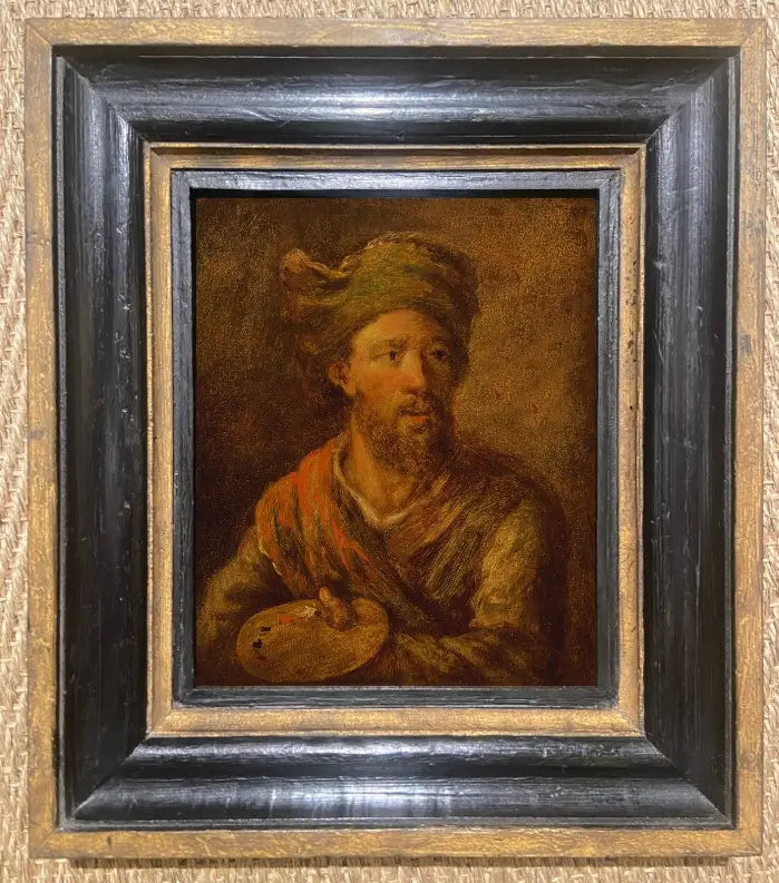 This is a self-portrait is most likely by a 17th century English artist holding the tools of his trade, a paint-loaded palette.