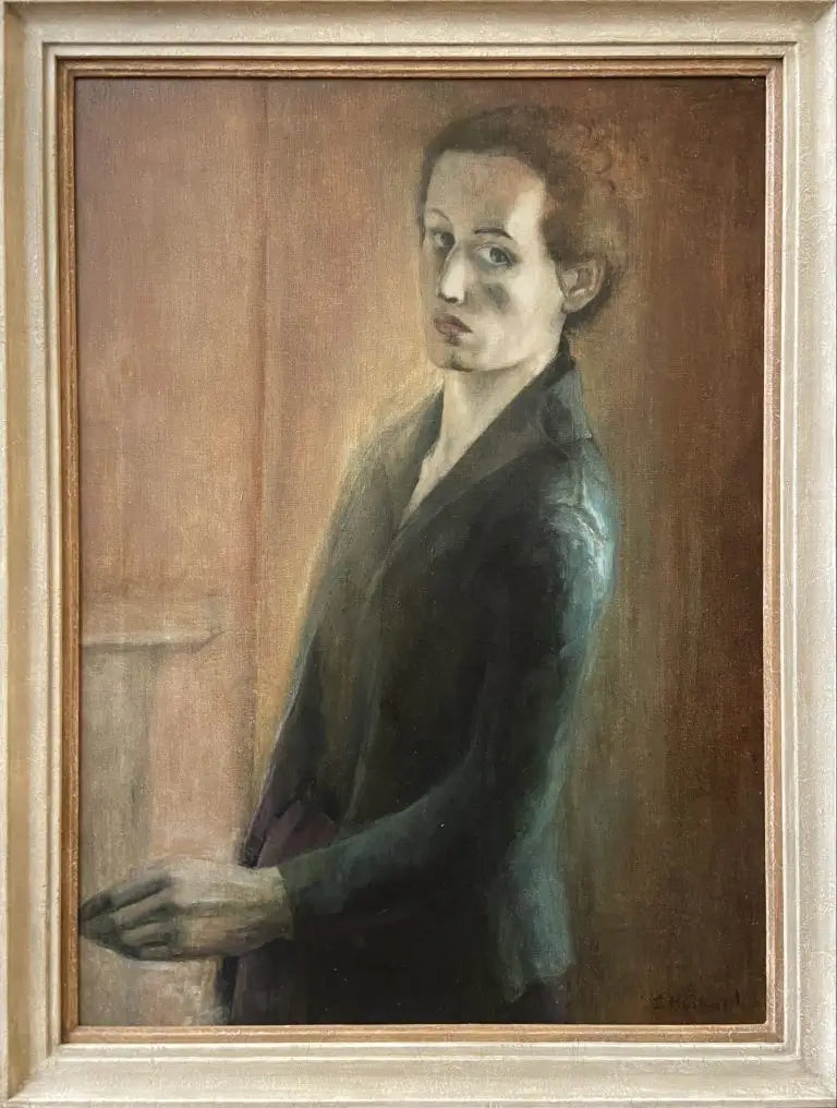 This is a wonderfully dynamic self portrait by the female artist Shelia Holland. Capturing herself in the process of drawing, or painting, this becomes a distinctive self portrait. Despite this, there is still an interesting juxtaposition as none of the artist’s tools are illustrated, and her canvas is cut out of the pictorial space. Perhaps this choice was made as to not distract from what is clearly the intension with this work – a deep and authentic self-examination by Holland into her physical appearance and her aura.