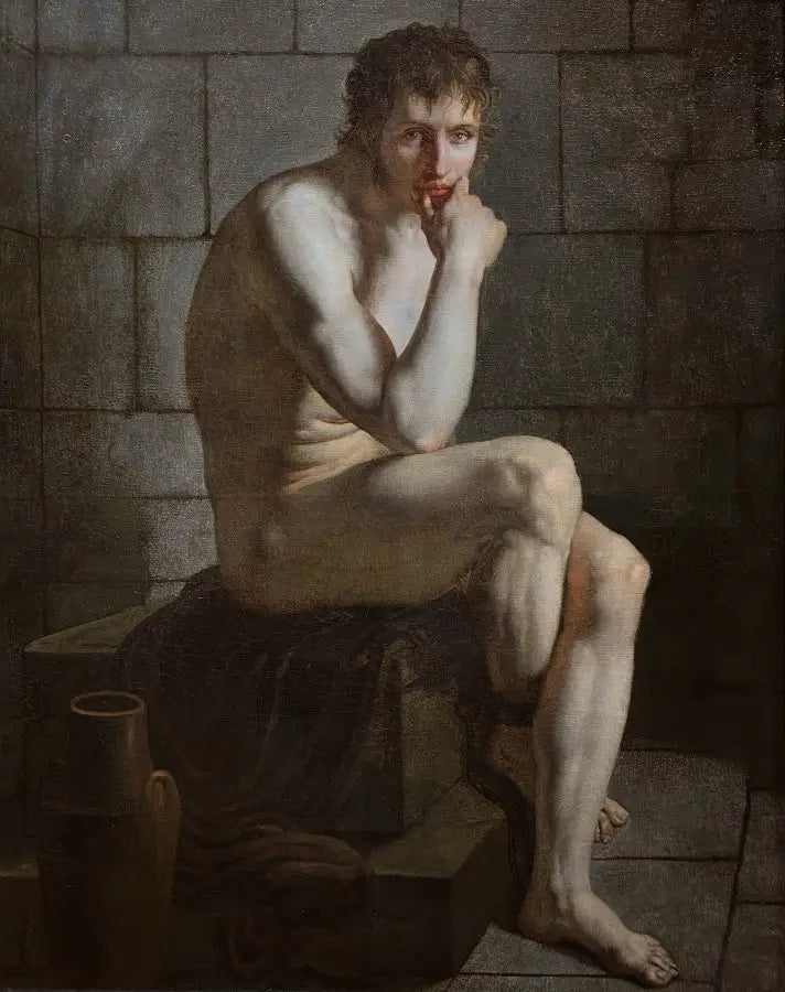 The artist sits shackled in a prison cell, with the moonlight flowing through a window in the top right corner. Guerin is expressing silent worry about the censorship re-established at the time by Napoleon. The painting is a melancholic prefiguration of Rodin’s Thinker