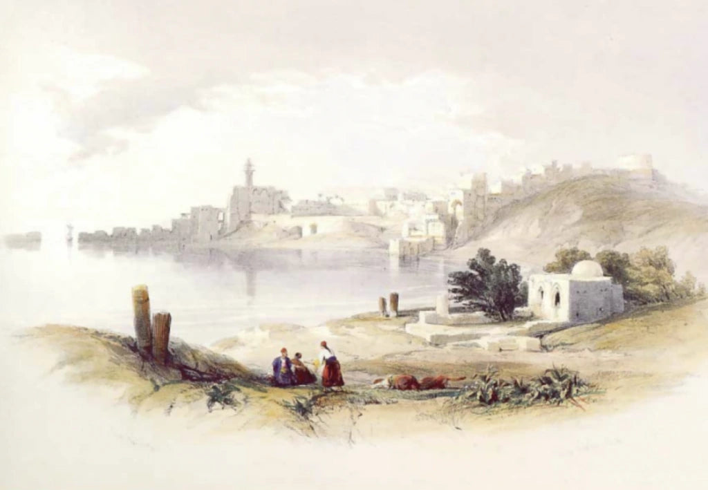 In the present lithograph, Roberts stands near to the tomb of Zebulon (the last of Jacob and Leah’s six sons), a few yards from a group of people who appear to be enjoying watching the sun setting behind the ancient city. The tallest structure on the skyline is the minaret tower of the Great Omari Mosque, built on the remains of the thirteenth century crusade fortress.