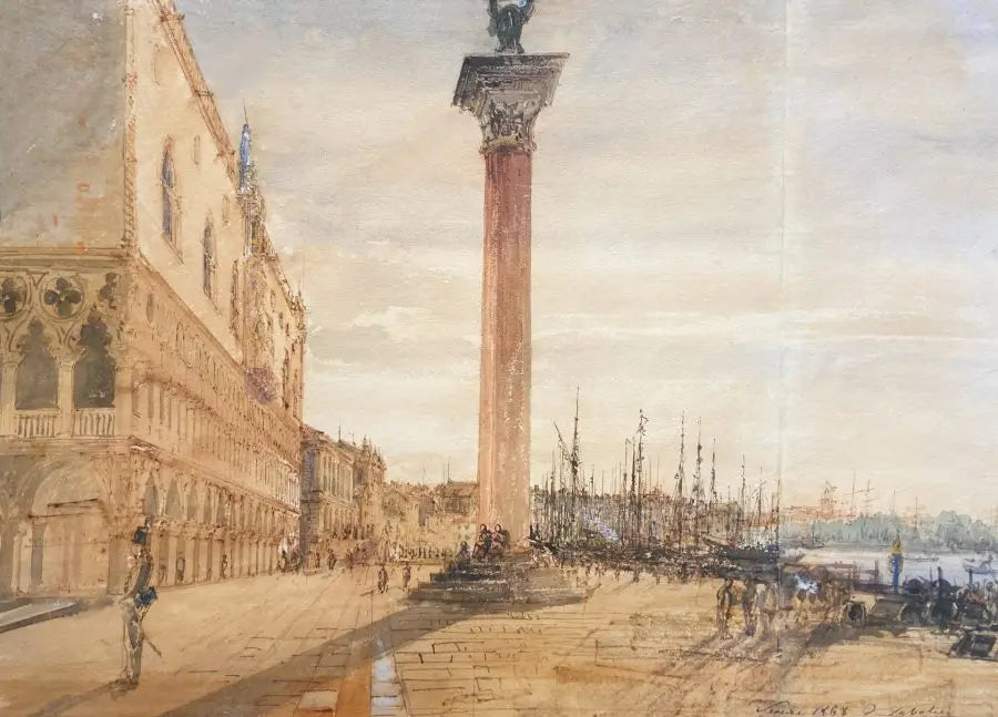 To the left of the column the ornate façade of the Palazzo Ducale can be seen with the Ponte della Paglia footbridge just behind. This landmark stone bridge was rebuilt as is seen here in 1847 and offers views of the Bridge of Sighs. Two years before this was painted Venice had become part of the Kingdom of Italy per the Treaty of Vienna in 1866.