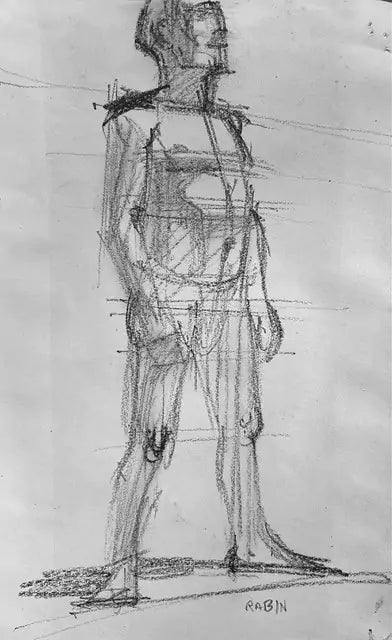Rabin’s life drawings were not anatomical drawings directly but instead emphasised the way the skeleton and muscle groups function. Rabin’s method was practical and enabled him to transform a subject, which could have presented itself as be maddeningly difficult to another artist, to one that was attainable and intriguing.