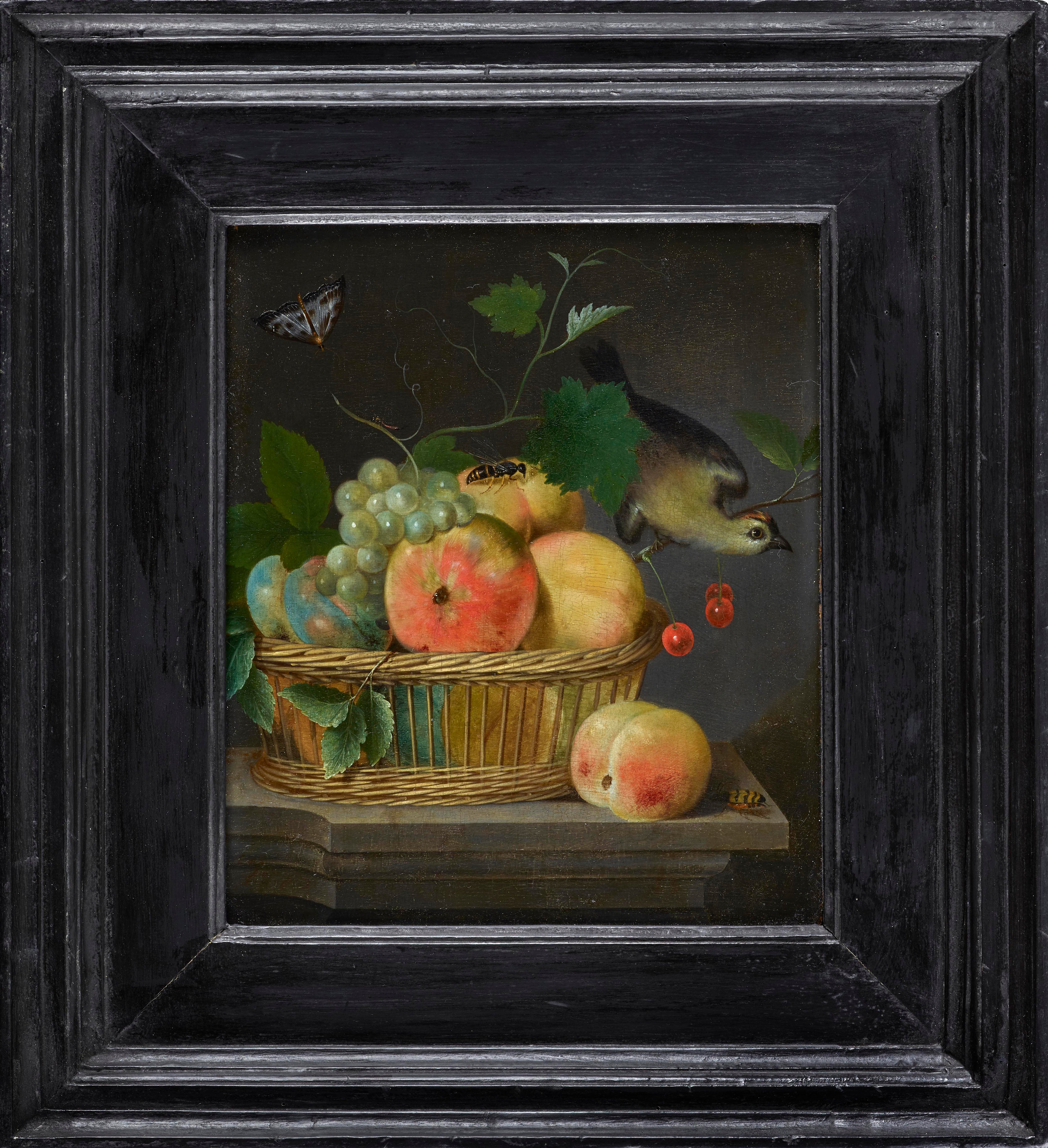 This intricate still life, representative of Dutch Golden Age ideals, captures the essence of fertility, prosperity and transformation. At the heart of the composition a wicker basket is seen overflowing with fresh fruits of plums and peaches, both signs of good health and fruitful marriage, their vivid hues evoking vitality. A bird is also depicted perched on a branch of ripe cherries, a sign of wealth and fertility. Cherries in the period were commonly used in Dutch paintings as a sign of the new age of global trade and consumption, an emblem of forging luxuries while also being commonly associated with the souls of men. Other symbols in the work that allude to fertility are seen through the represented insects, the wasp as a sign of change and the moth as a symbol of transformation. Additionally, the glistening opulence of the cluster of grapes contributes to the paintings overarching message of a celebration of the fruits of life, fertility as well as health and transformation, inviting the viewers to reflect on the interplay of nature and human existence through timeless motifs.