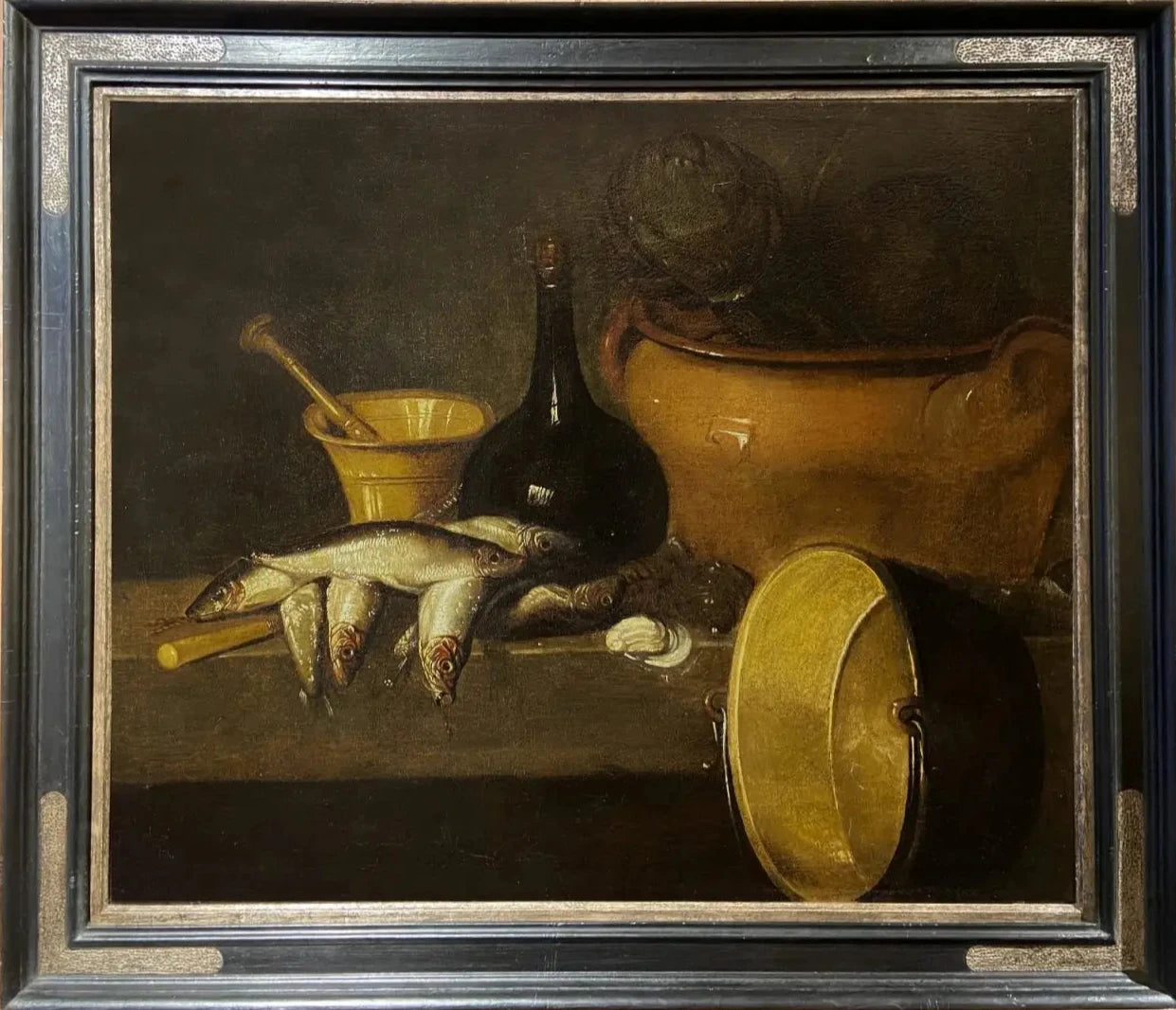 This is an incredibly carefully executed work. On what appears to be a wooden ledge we see a plate of freshwater fish, possibly a roach, a copper pot, a larger terracota pot with two artichokes. The rich earth colour of copper kitchen pots and pans keep the painting within a narrow chromatic range and there is a rhythmic contrast between rounded and jagged shapes and between patterns. While the comestible items in many still-life paintings serve no obvious allegorical purpose, they can be viewed as reminders of the transient nature of luxury, the virtue of temperance, or the perils of gluttony.
