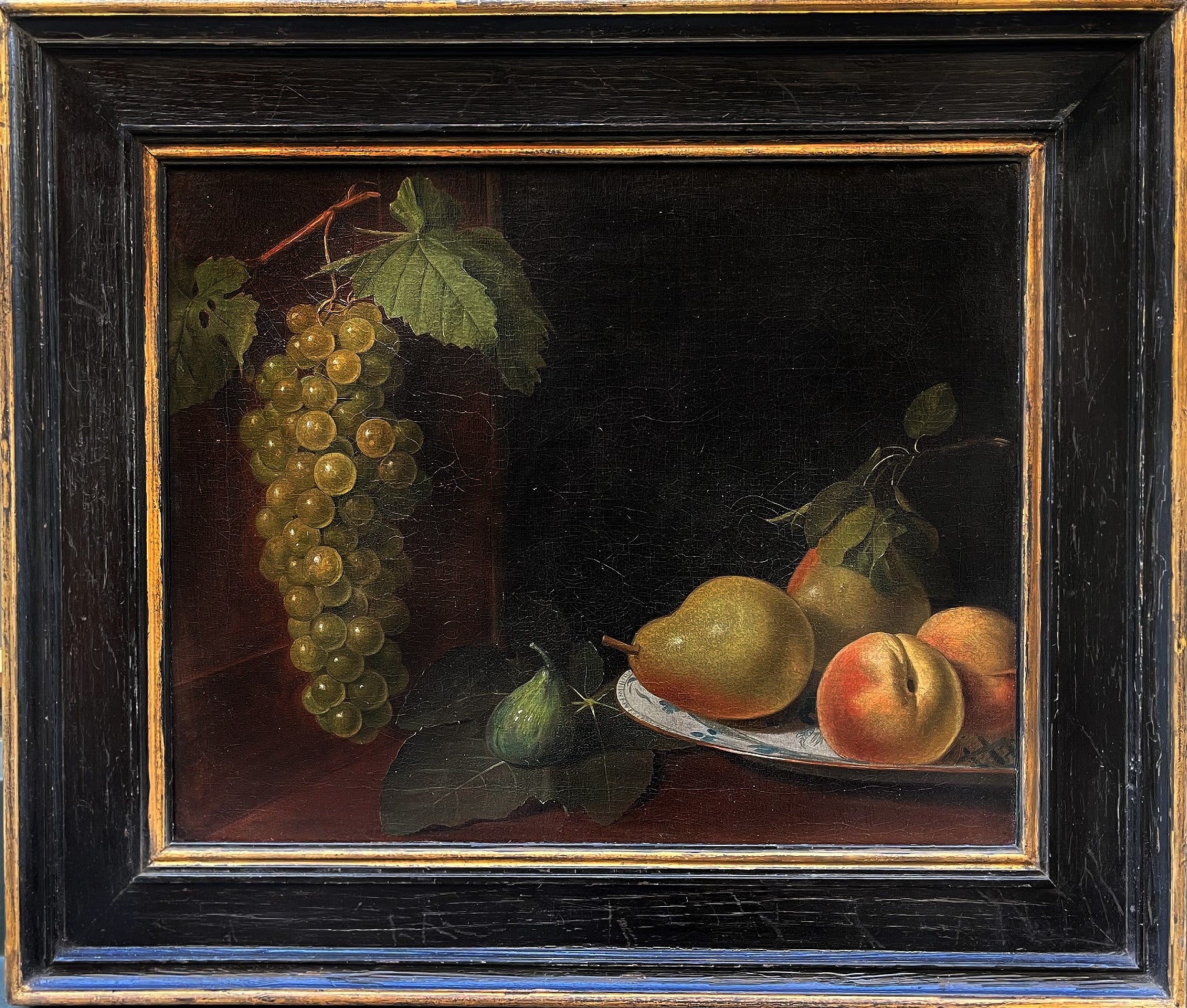 This complex and convincing composition is painted from a frontal perspective. In the lower half is a wooden shelf or table on which several elements are skilfully arranged. On the right is a Delft plate, the handling of the gilt edge is pure genius, the light hits the edge and we see the undulations on the rim of the plate on which two masterfully painted peaches and two pears rest. A tone of elegant refinement is set by these motifs, which appealed to the taste of the artists socially distinguished and cultivated clients.