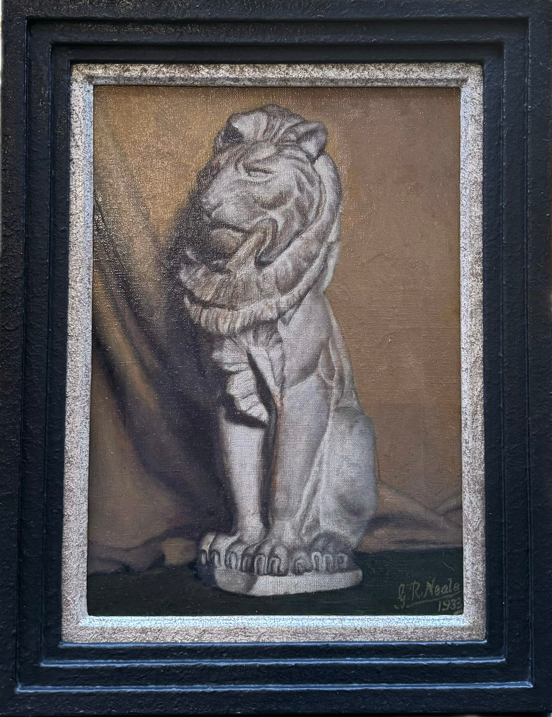 Accentuated by the works golden tones, the painting is a duality of strength and stillness. Explored through the compositions stoic stone lion; angled to gaze just out of frame; in contrast with the draped ochre curtain of the piece's background.
