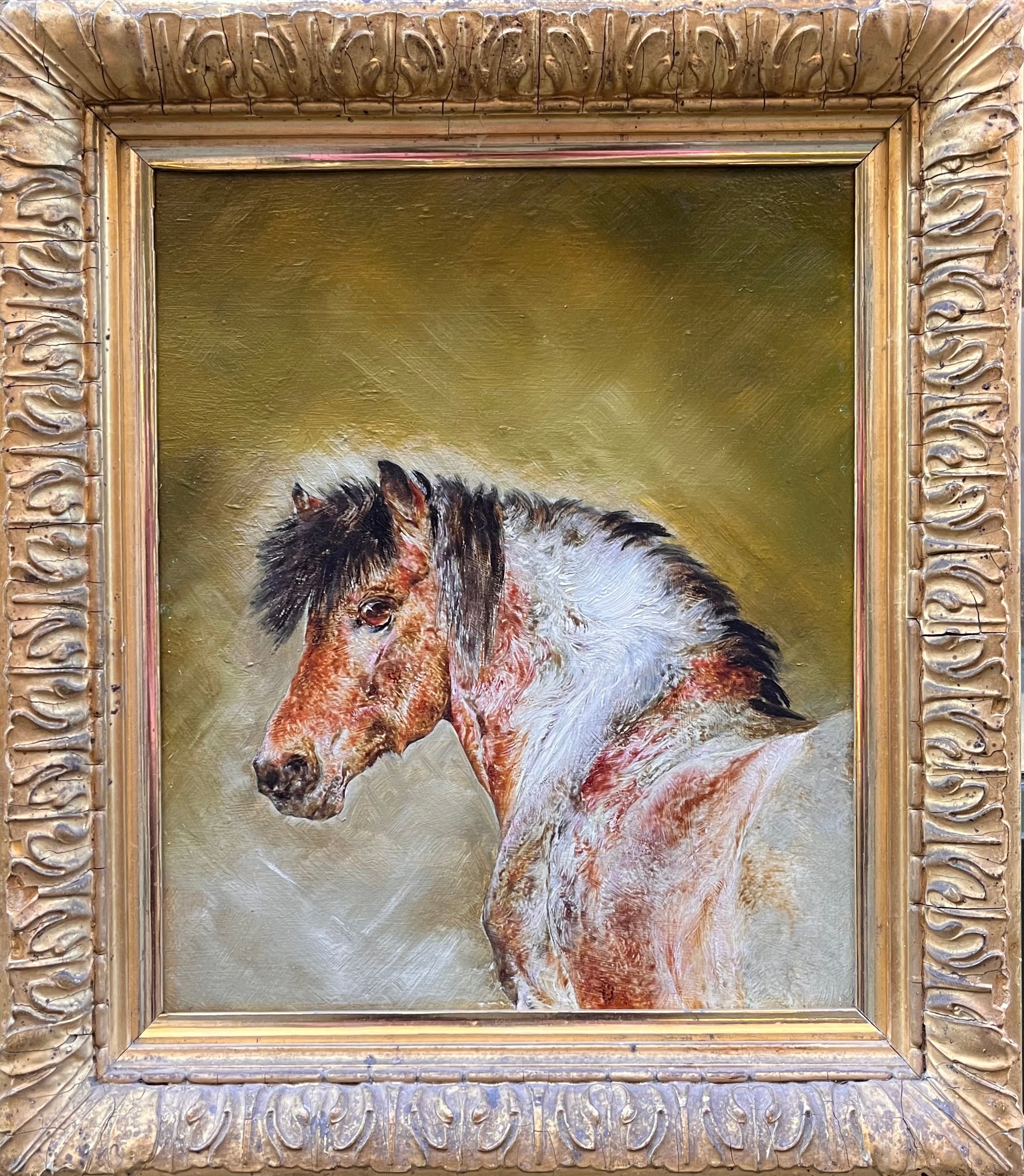 Huggins’ equine painting depicts a pony with its head turned towards the viewer, regarding us cautiously. The painting is strikingly naturalistic, particularly in regard to the pony’s coat - the swirling brushstrokes realistically suggest the wiry feel of horse hair and connote a shaggy coat. The physiology of the pony’s shoulder is also incredibly accurate, demonstrating the slight muscular protrusion of the shoulder over the rest of the front leg. The pony’s eye is outstanding, and gazing into it truly makes the viewer feel as if they are making eye contact with a living, breathing creature. The vivid colours only heighten this sense of realism, and pay homage to Pre-Raphaelite techniques that Huggins was strongly influenced by.