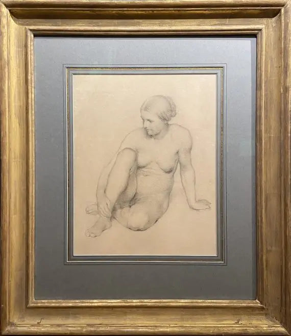 This is a delicate 19th century academic graphite drawing of a seated female nude in the neoclassical style.