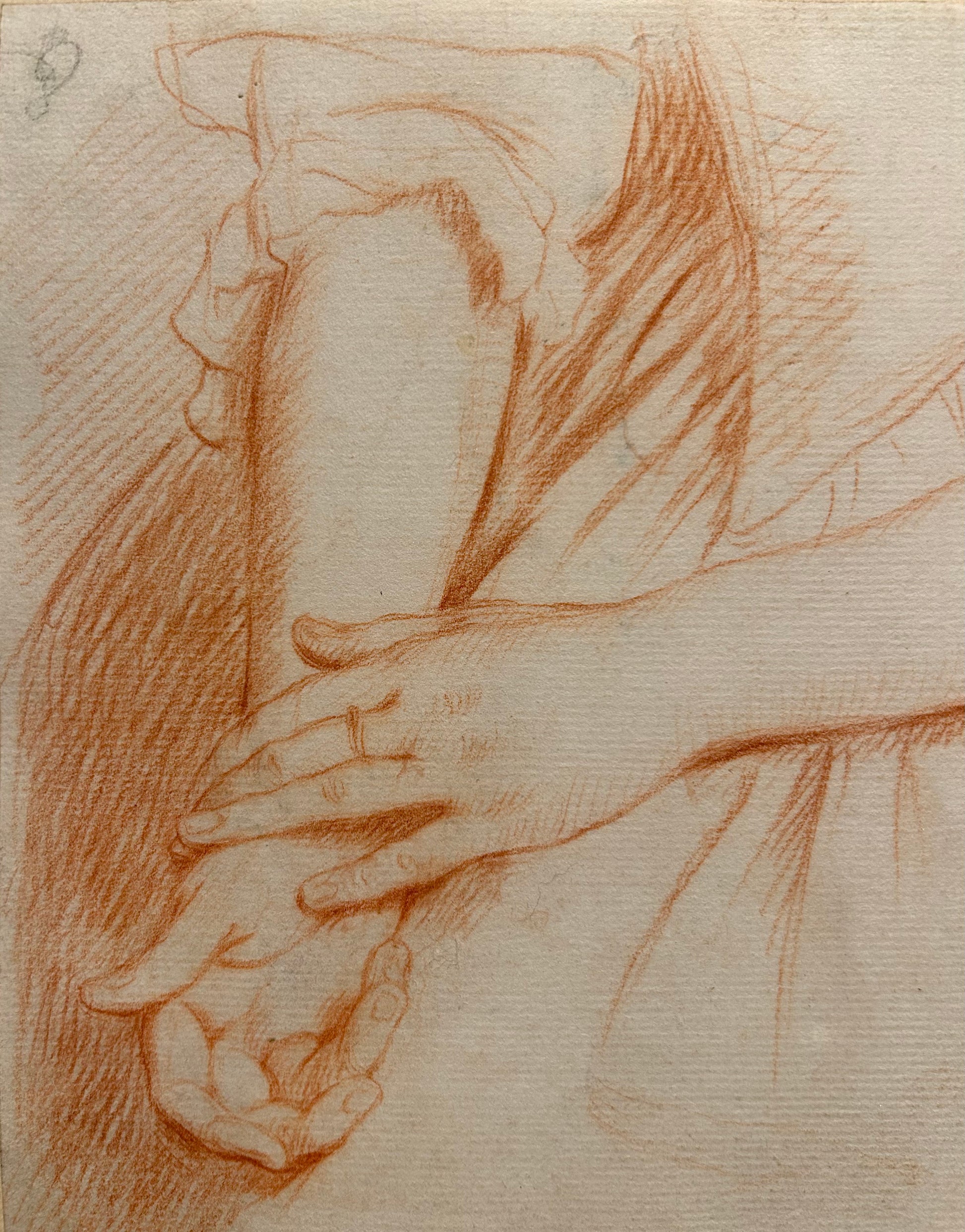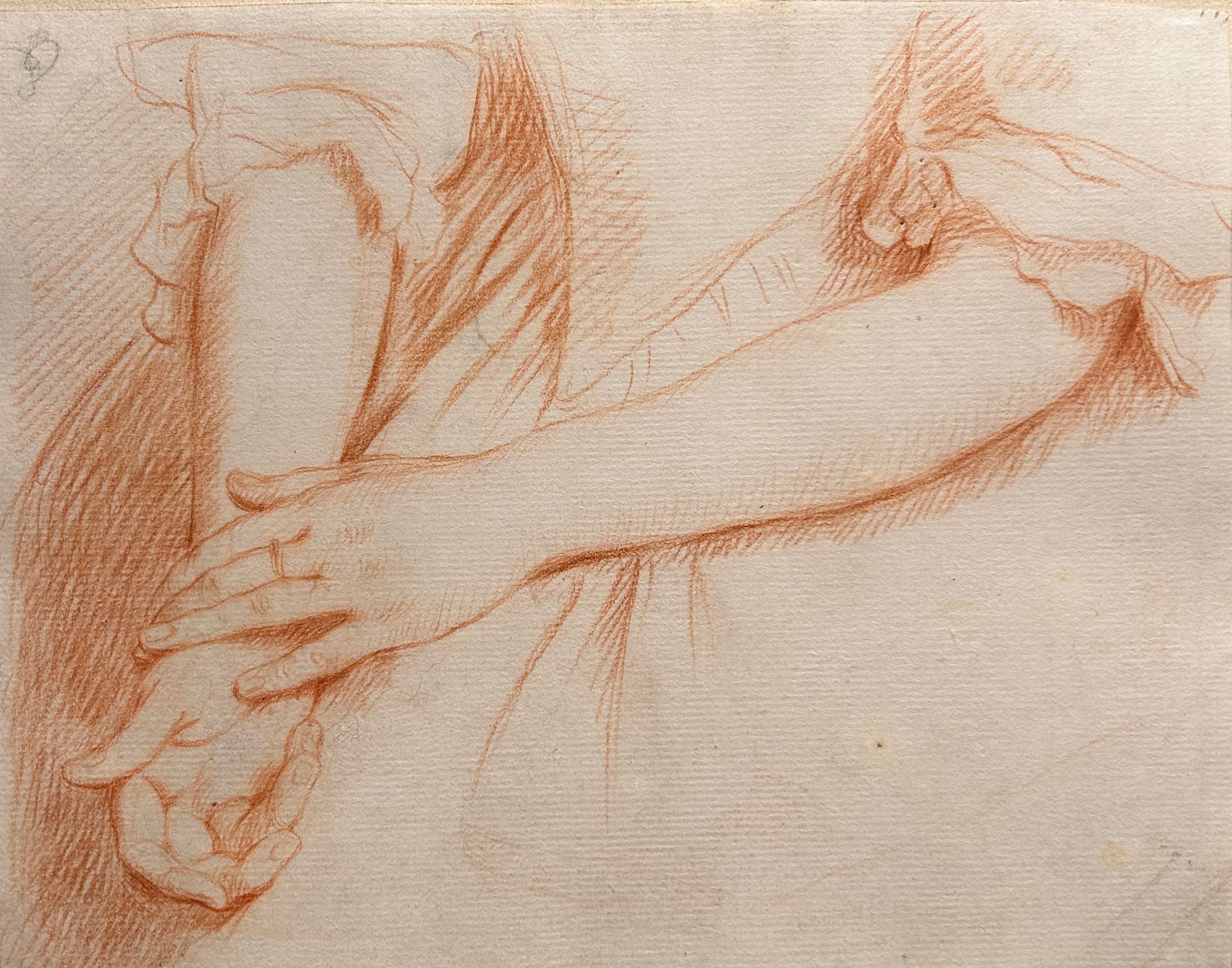 This fine drawing is a study of a lady’s hands resting in her lap, completed with a key attention to detail. Whilst the fabric creases and ruffles are still depicted with a high level of detail, the focus of the study is firmly on the lady’s hands. The red chalk hatching masterfully denotes the joints in the lady’s fingers, as well as the creases in the skin of her palm. The positioning of her hands implies a certain modesty, as the lady is subtly closing her body off. Whilst a naturalistic gesture, it must be noted that this study has allowed the artist to depict both an upturned and a downturned hand within the same composition. It is likely that this study was preparation for a larger portrait or genre scene.