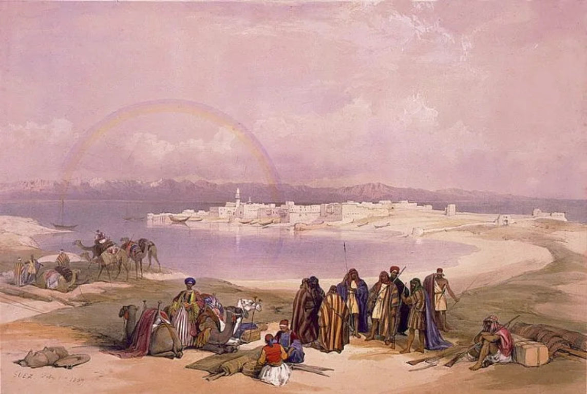 Roberts and his party set off from Cairo on the 7 February and arrived at Suez, which stands at the northern end of the Red Sea, on the 10 February. They stopped there only very briefly, for two days later they had re-mounted their camels and had set out into the Sinai desert bound for Petra and Syria. Despite this, Roberts took the opportunity to draw.