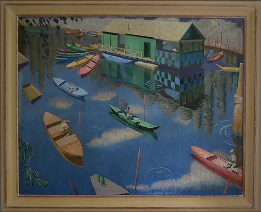 From 1933 until 1970, Lloyd exhibited regularly with the ROI, and showed at the Royal Academy of London. The titles testify to Lloyd’s love for mediterranean Europe – Italy, Spain, France, Turkey and Morocco, inspiring joyful land, sea and mountainscapes, in a style that evoked impressionism. Lloyd was a prolific painter who was able to paint fast, preferring textural oil and pastels.