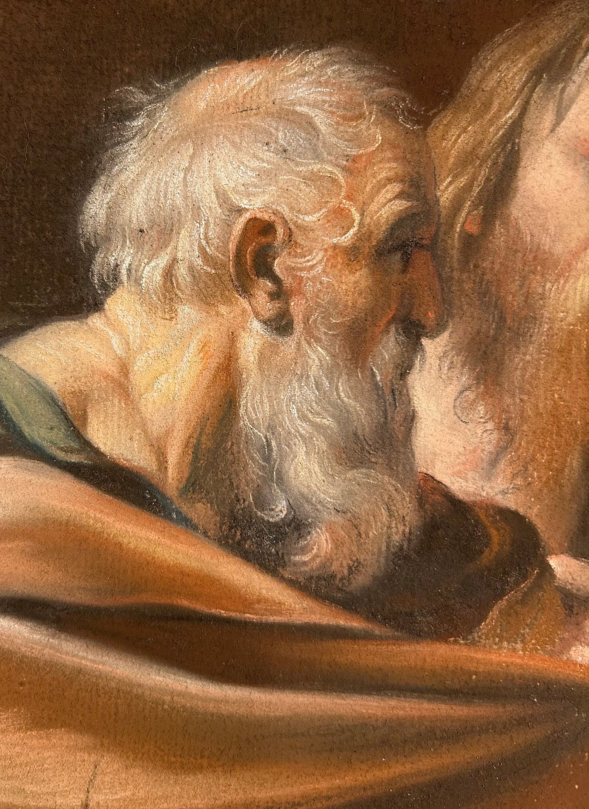 The colours, undoubtedly more vivid in 1769 than today, are beautifully recorded by Pine. For instance, areas like St Peter’s warm ochre-brown robe, which was obscured before cleaning, were faithfully recorded. However, the lower part of Christ’s robe that cleaning revealed to be dark purple rather than green stands as the only inaccuracy.