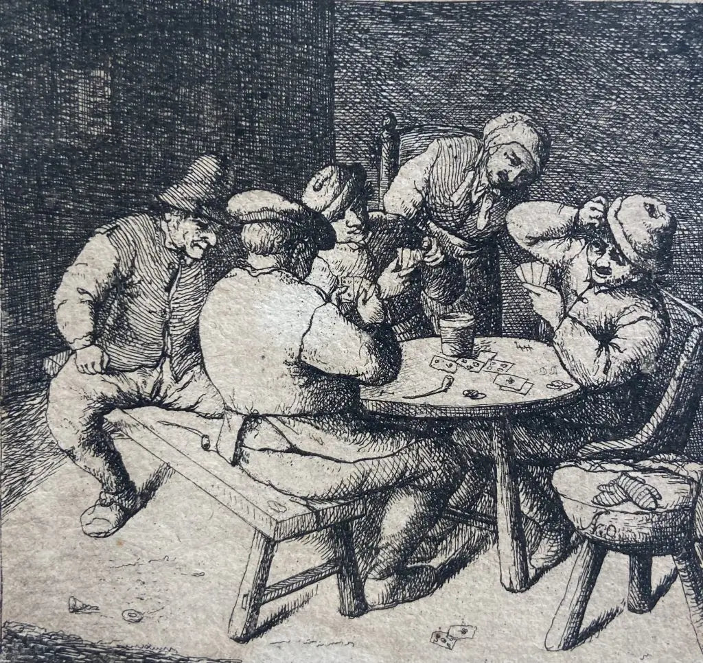 This wonderful etching shows a group of five men playing a game of cards around a small rickety table. The group is made up from a selection of colourful characters, all fully immersed in the activity. The detail of the scene is breathtaking, note the coins and pipe on the table to the fallen cards by the men’s feet.