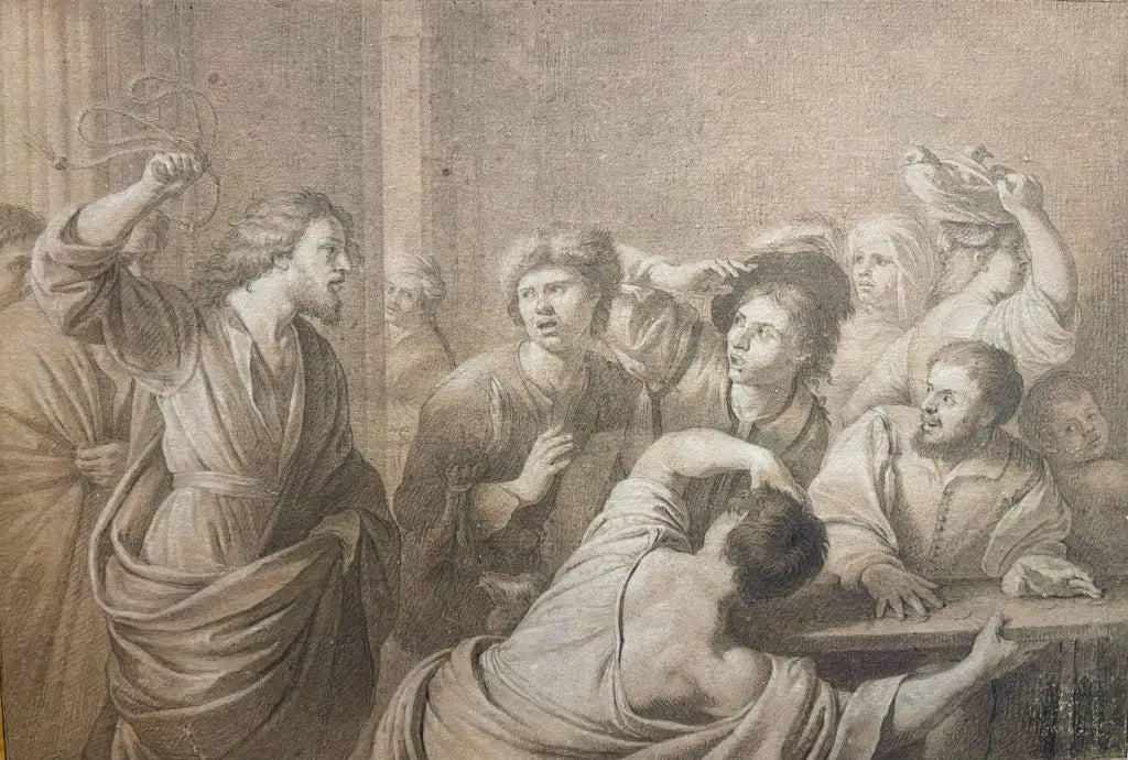 This wonderful drawing depicts ‘The Cleansing of the Temple’, a biblical narrative where Christ expels merchants and the money changers from the Temple in Jerusalem. This is recounted in all four canonical gospels of the New Testament. In theses accounts, Christ and his disciples travel to Jerusalem for Passover. It is here where Christ comes across merchants and consumers in the Temple and in turn accuses them of turning it into a ‘den of thieves’ (Synoptic Gospels) and a ‘house of trade’ (Gospel of John) through their commercial activities. Consequently, Christ drives out all of those who were buying and selling on the Temple site, overthrowing the tables of the moneychangers.