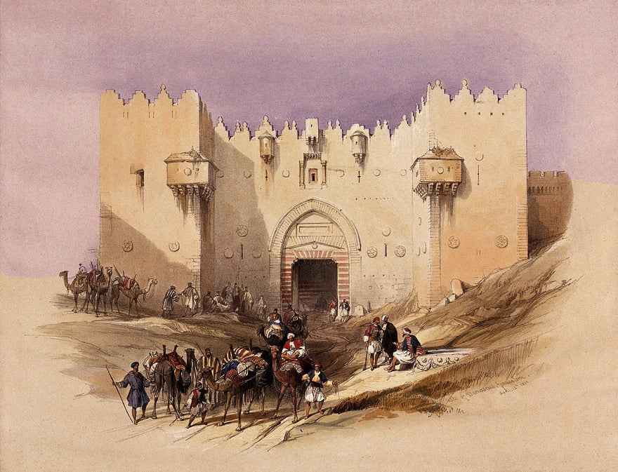 Jerusalem has four open gates and four walled up: which seem in general to retain the places of still older ones, and, in some instances, to be older than the walls. Of the four open gates, facing the four points of the compass, that of which the view is given looks to the north, and is called by the natives Bab-el-Amud, of “Gate of the Pillar,” The “Damascus Gate” is a name given by the Europeans, from its leading to Damascus and Nabulus by the great northern road. It is more ornamented than the others, and forms a striking objects to the traveller.