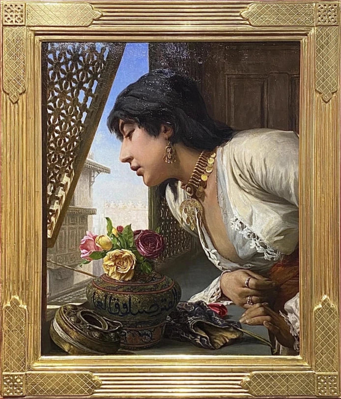 This well observed and sensitively painted portrait depicts an elegant young Egyptian woman, leaning out of her window to gaze onto the street below. From what we can see of the interior space, it is richly furnished – an open cloth bag lies on the window sill next to an ornate ball incense burner. The incense burner has been filled with blooming roses and the removed lid bears the artist’s signature. The woman herself wears extensive golden jewellery and a fringed cream gown with a red sash tied around her waist. This is a scene of beauty, wealth and fragrances.