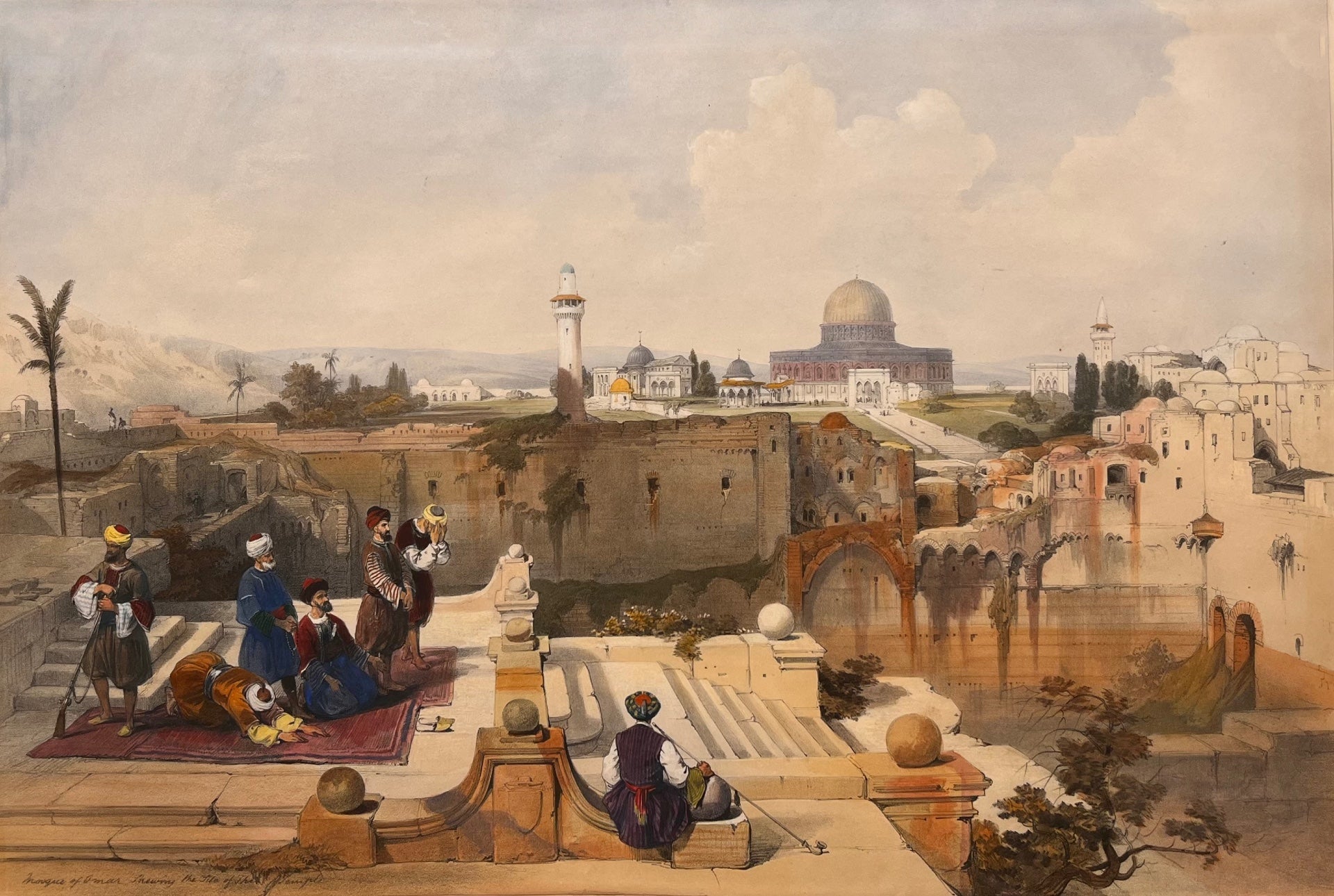 The Mosque of Omar, more usually known as the Dome of the Rock, was built by Caliph Abd-el-Malik (687-705) on the site of the Temple of Solomon. The latter was destroyed against the Emperor's orders, during the Roman sack of Jerusalem in 70 CE. Revered by Moslems as the site from which the prophet Muhammad ascended to heaven, and by Jews and Christians as the place to which Abraham led Isaac intending to sacrifice him