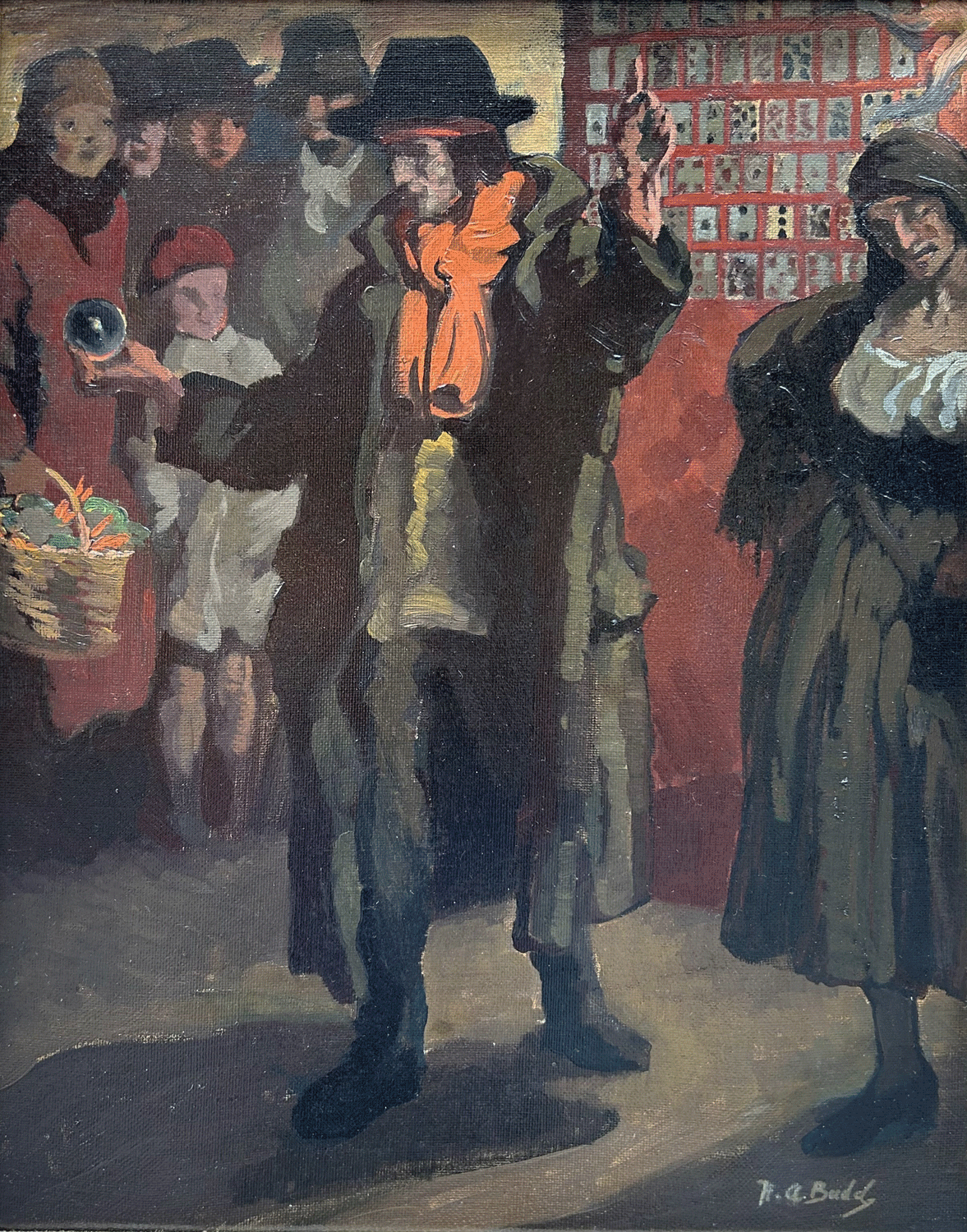 Budd was known for his paintings depicting scenes of life from London, so it is likely that the setting of this painting is an anonymous London street. It is easy to see a continuity between the performer depicted in this work from the early 20th century, and the variety of magicians and acrobats enticing crowds in today’s world.