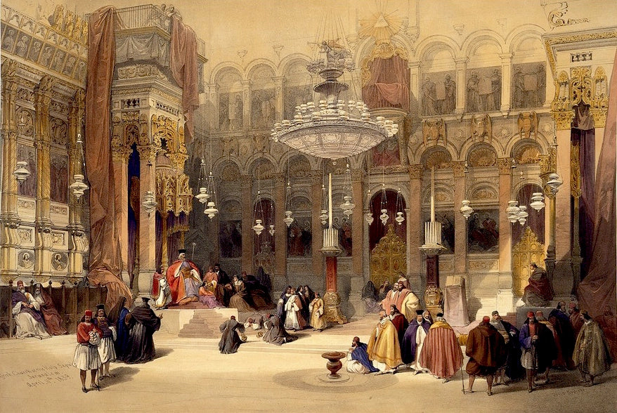 Mr Roberts's Journal describes the scene "March 31, 1839 (Palm Sunday).—This is a great day at the Holy Sepulchre, and we witnessed the procession early in the morning. Perhaps after seeing the splendid sights of this kind in Spain, they were seen to disadvantage, still to me they were most interesting. The Latins took no part in the spectacle, being shut out on account of the plague, and holding no communication with the city."