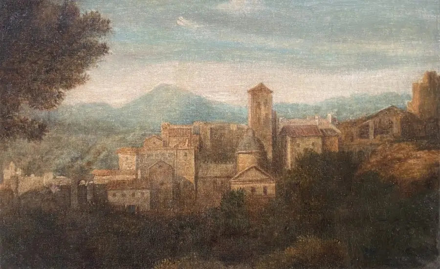 This is a classic Italian landscape painted in an academic style, taking inspiration from the Roman Campagna. This landscape, with its recession through a series of planes, soft, warm lighting and classical subject matter, draws on the example of artists such as Claude Lorrain and Gaspard Dughet.