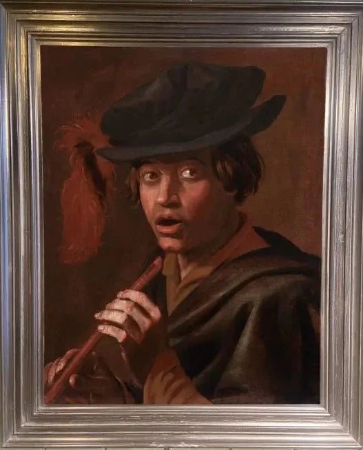 This head and shoulders portrait is an outstanding example of the breadth, force and beauty of this artist’s pictorial manner and abilities. This captivating portrait features a musician holding his recorder, dressed in a dark robe and feathered cap. The recorder appears to be a five-hole Alto Recorder in F-sharp, a popular choice with musicians around the middle of the 18th century.