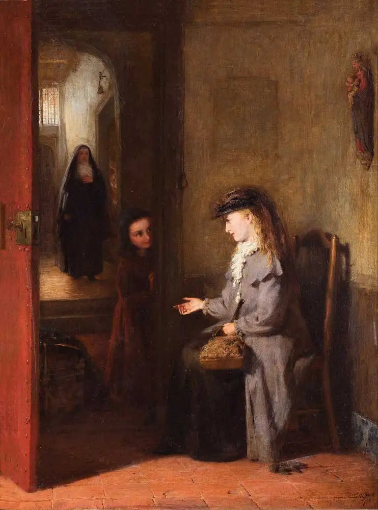 The painting depicts the arrival of a new teacher - a curious pupil peeps around a door to see her while her friends look through the open door to the classroom to catch a glimpse.