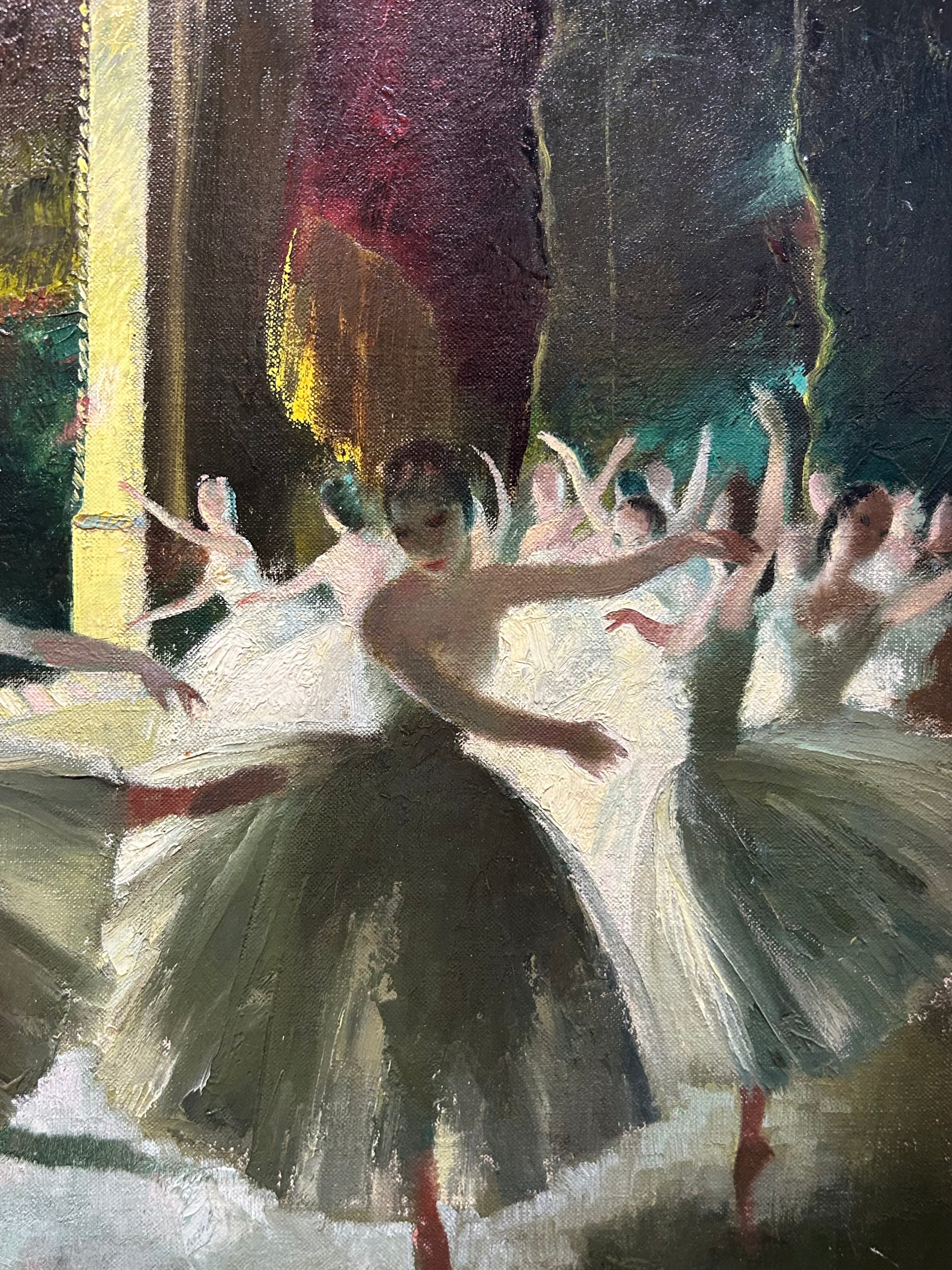 The lighting is arguably the most masterful element of this painting - the dramatic stage lights cast the ballet dancers in extreme brightness and darkness. The lights cause the dresses to shine a brilliant white, whilst the shadows render the forms of the dancers vaguely visible under their skirts, suggesting the translucency of the dress fabric. The defined beams of light also illuminate a muted but sumptuous theatre setting, but ensure that the spotlight - to pardon the pun - remains firmly on the beautiful, poised ballet dancers.