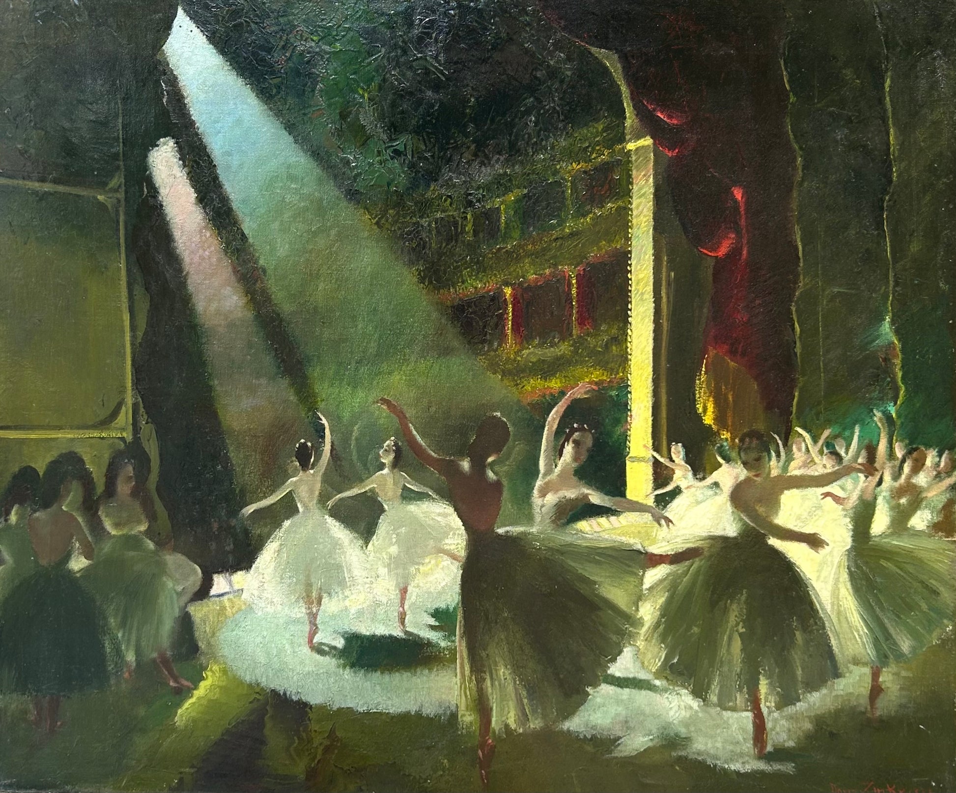 This dramatic painting depicts ballet dancers performing, from the perspective of someone standing backstage. The subject matter and unique perspective is likely taken from Zinkeisen’s time as a set and costume designer, as this would have been a view that she was all too familiar with.