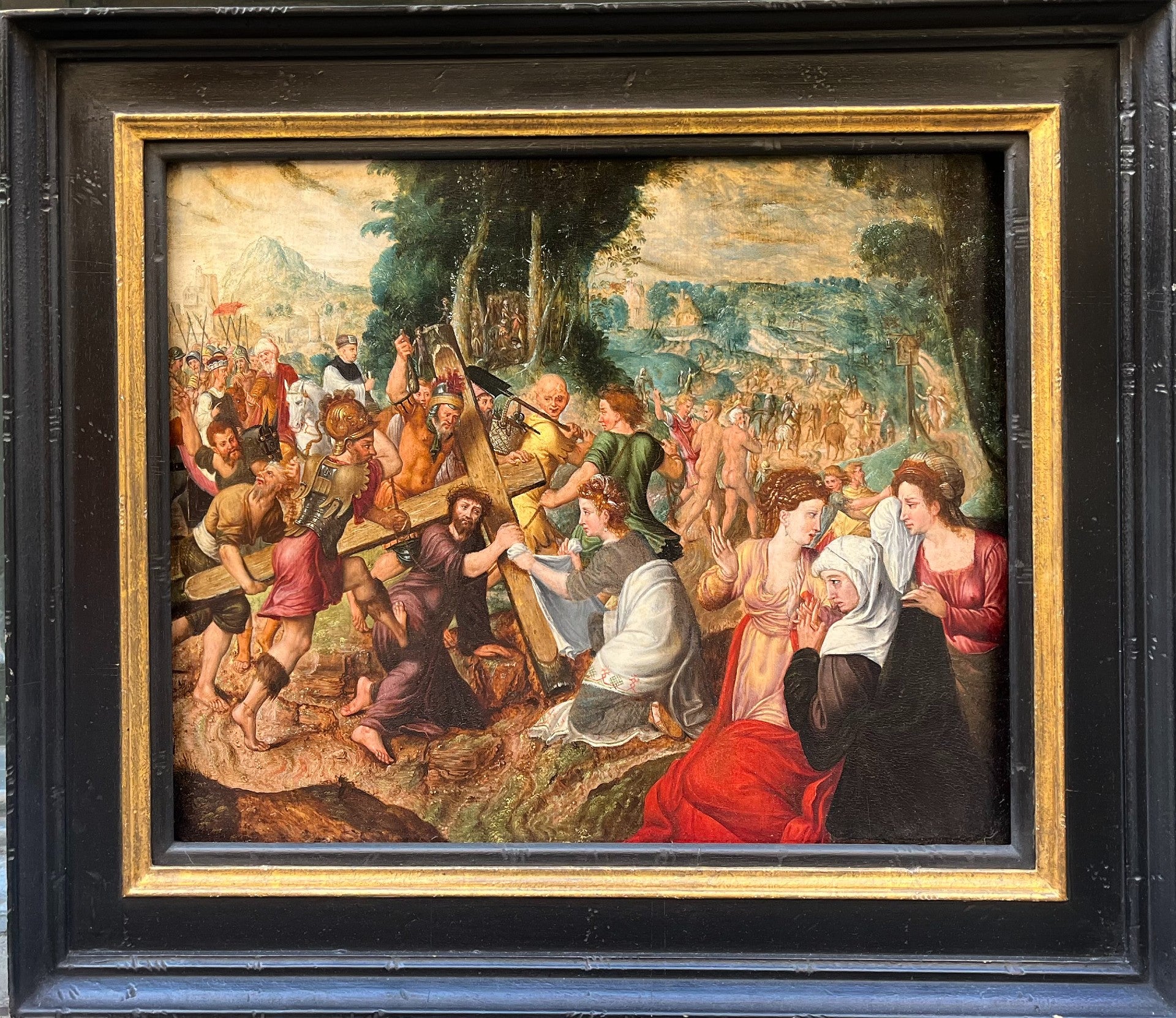 Christ’s path to Calvary was a stage of the Passion emphasized by Northern artists, who showed him suffering at the hands of tormenters accompanying him to the site of the Crucifixion. Herri Met de Bles instead shows the moment when Simon the Cyrene temporarily alleviates his suffering by helping him carry the cross, demonstrating the redemptive value of following and imitating Christ. Locating this scene within a vast landscape replete with eye-catching details requires the viewer’s devoted attention, a strategy the artist employs perhaps to moralise the act of looking. The compositional scheme is typical of the Antwerp “world landscape” painting tradition conceived by Joachim Patinir, and culminating in the work of Pieter Brueghel. The first European landscapes since antiquity, they encompassed a staggeringly diverse description of the earth’s topography and often included a variety of cityscapes as well. The impressive scope of this panorama reminds audiences of the universal implications of Christ’s sacrifice.