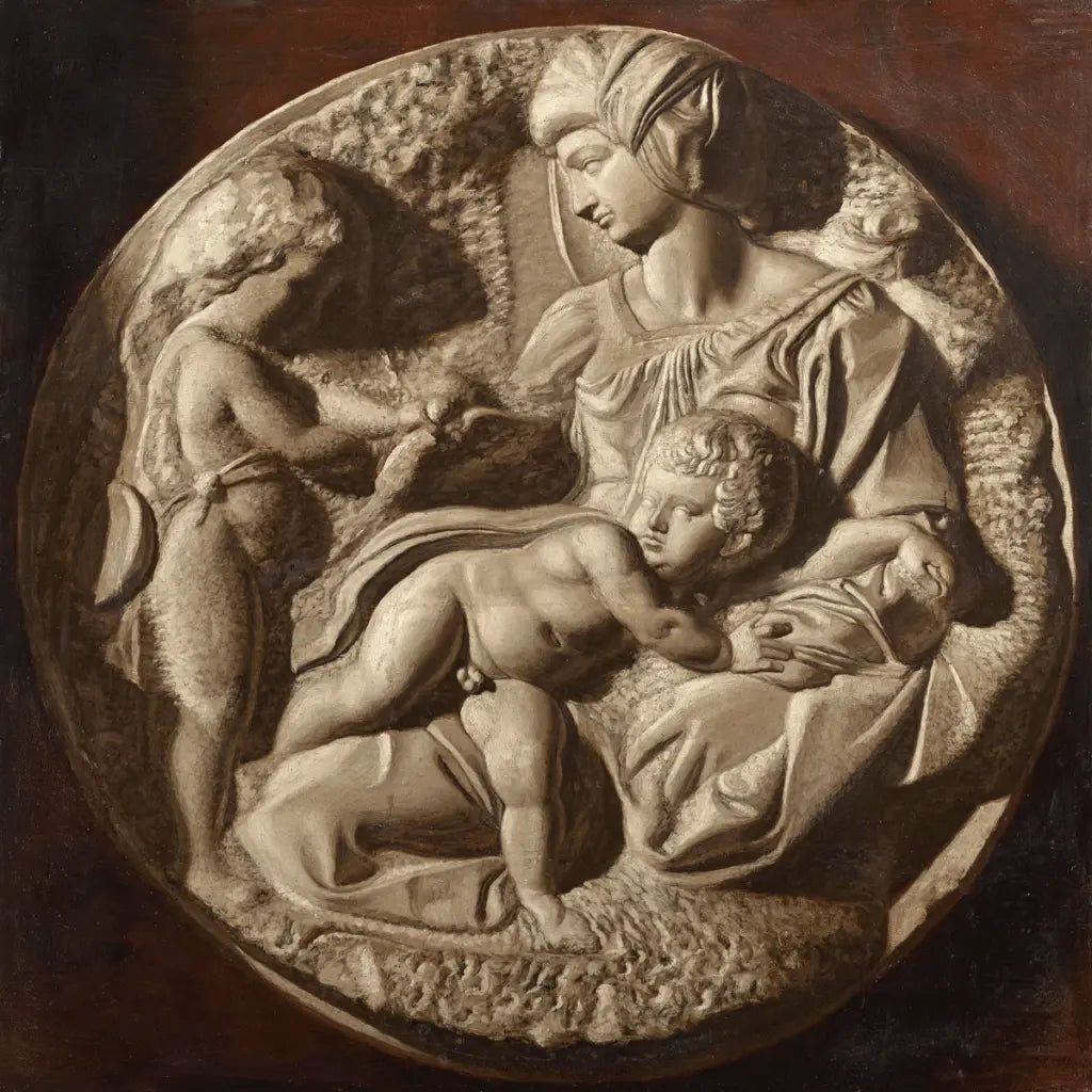 This painting is an accomplished portrayal of Michelangelo’s sculpture The Virgin and Child with the Infant Saint John, also known as the Taddei Tondo.