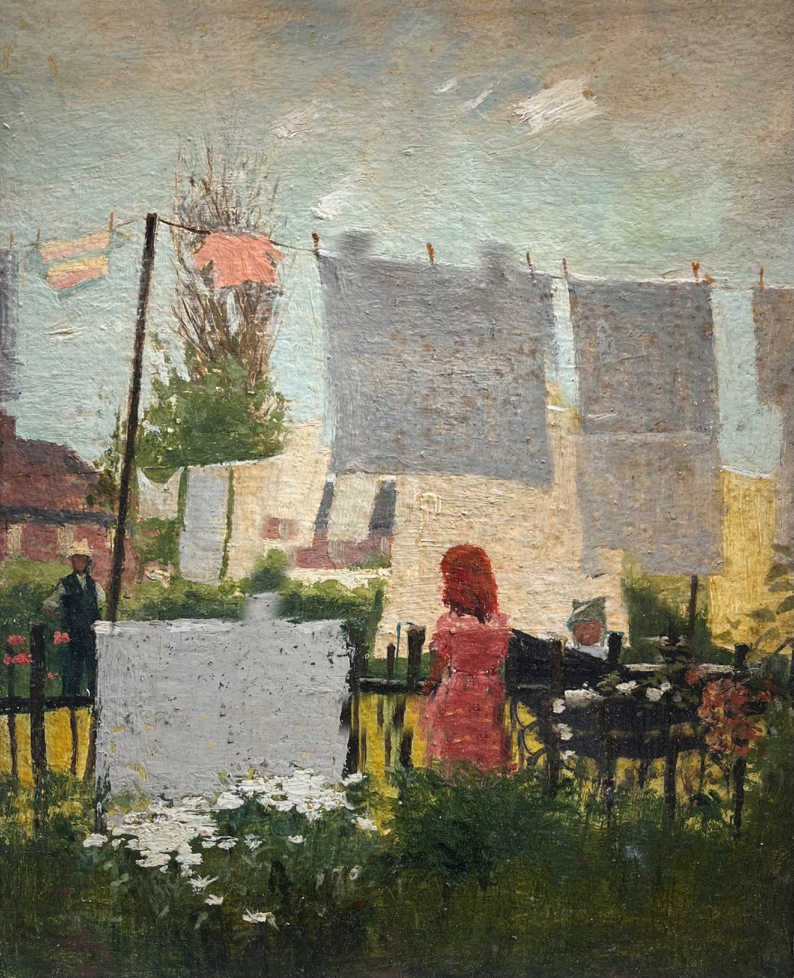 This humble scene depicts a young girl peering over a fence to amuse a young child, sat upright in a pram. A male figure watches on in the background, supervising the two children. Washing lines cut across the sky above the figures’ heads, whilst a row of 1930s-era semi-detached houses provides a backdrop to the scene. Clearly, this painting depicts a snapshot of post-war life as experienced by the artist.