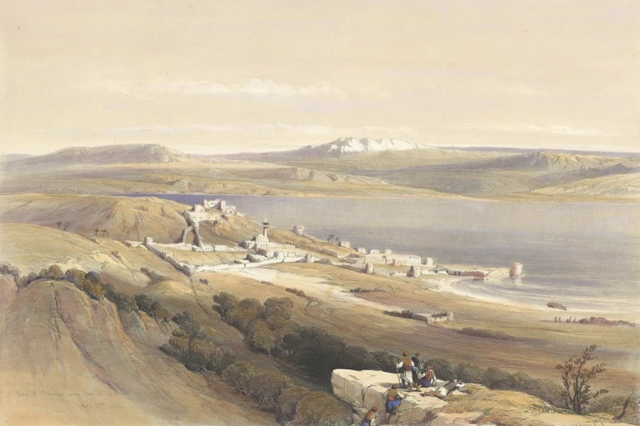 In this lithograph, Roberts captures the sublime nature of Tiberias’s surroundings and in the foreground places a group of figures that survey the scene from a high vantage point.