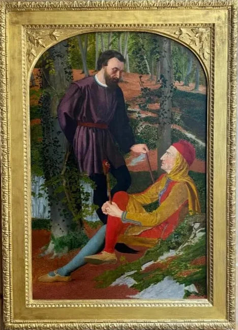 The subject of the present picture is the dialogue between the court jester Touchstone and the shepherd Corin in the Forest of Arden ( As You Like It, Act III, scene 2). The work of William Shakespeare 'As You Like It' was a popular literary source in Pre-Raphaelite circles, inspiring such artists as John Everett Millais, Walter Howell Deverell and Arthur Hughes. The present picture is comparable in style to the work of Edward W. Rainford and Henry Stacy Marks (1829-1898). Marks' picture Hamlet, Horatio and Osric, shown at the National Institution in 1854 makes a good comparison, as does Rainford's Hotspur and the Courtier (Forbes Magazine Collection; see Shakespeare in Western Art, exhibition circulated in Japan by the Tokyo Shimbun, 1992-3, no. 70, reproduced in catalogue), an illustration to Henry IV, Part 1 which was exhibited at the British Institution in 1852.