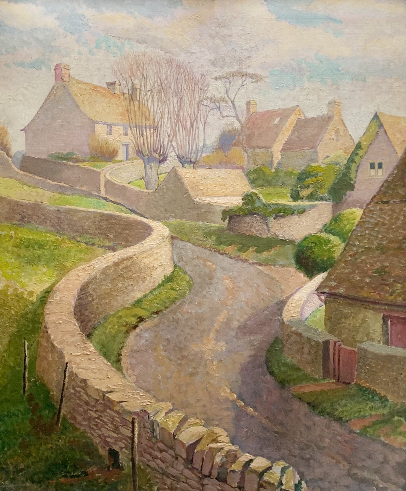 In this painting the artist has captured the movement and perspective of the winding lane, through the village. In the background, the Cotsworld stone houses and walls evoke the picturesque charm of this West England Village, while the bright green of the grass and trees adds vibrancy to the composition.