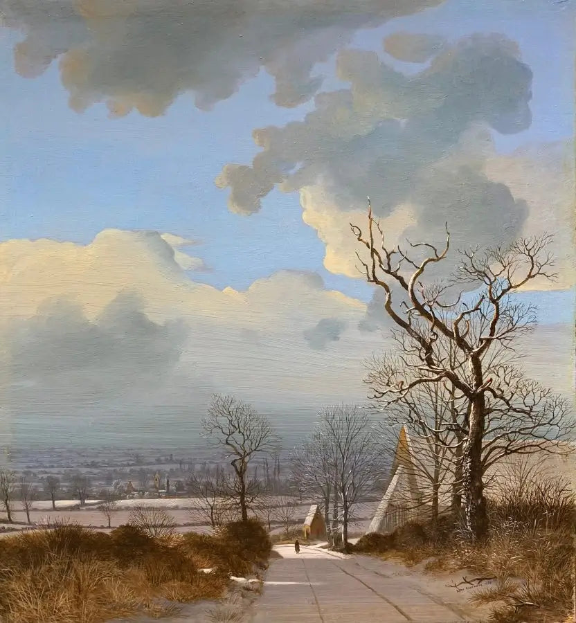 As part of his four-seasons collection, Newcombe masterfully captures the changing patterns of the year. In this panel titled Winter, Newcombe portrays the snow covered, barren landscape stretching across the composition, evoking the essence of the frosty months. The townscape, meticulously detailed and enveloped by heavy clouds on a crisp, fresh day, transports viewers to the depths of winter.