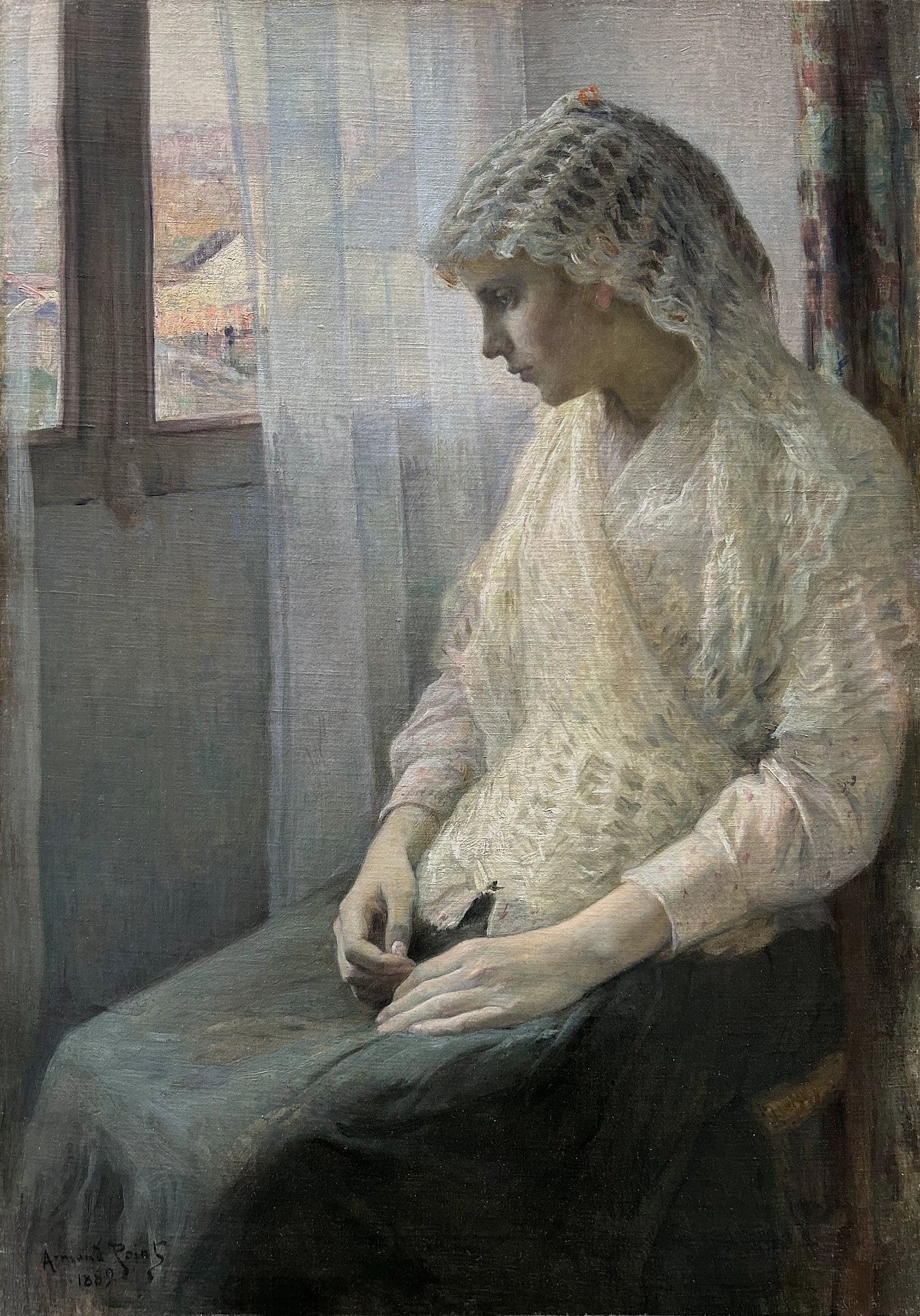 She is posed in an attitude of peacefulness. Here the woman gazes of into the distance, caught in thought as she sits by a window. The purple cool tones reflecting the fresh morning breaking upon the horizon.
